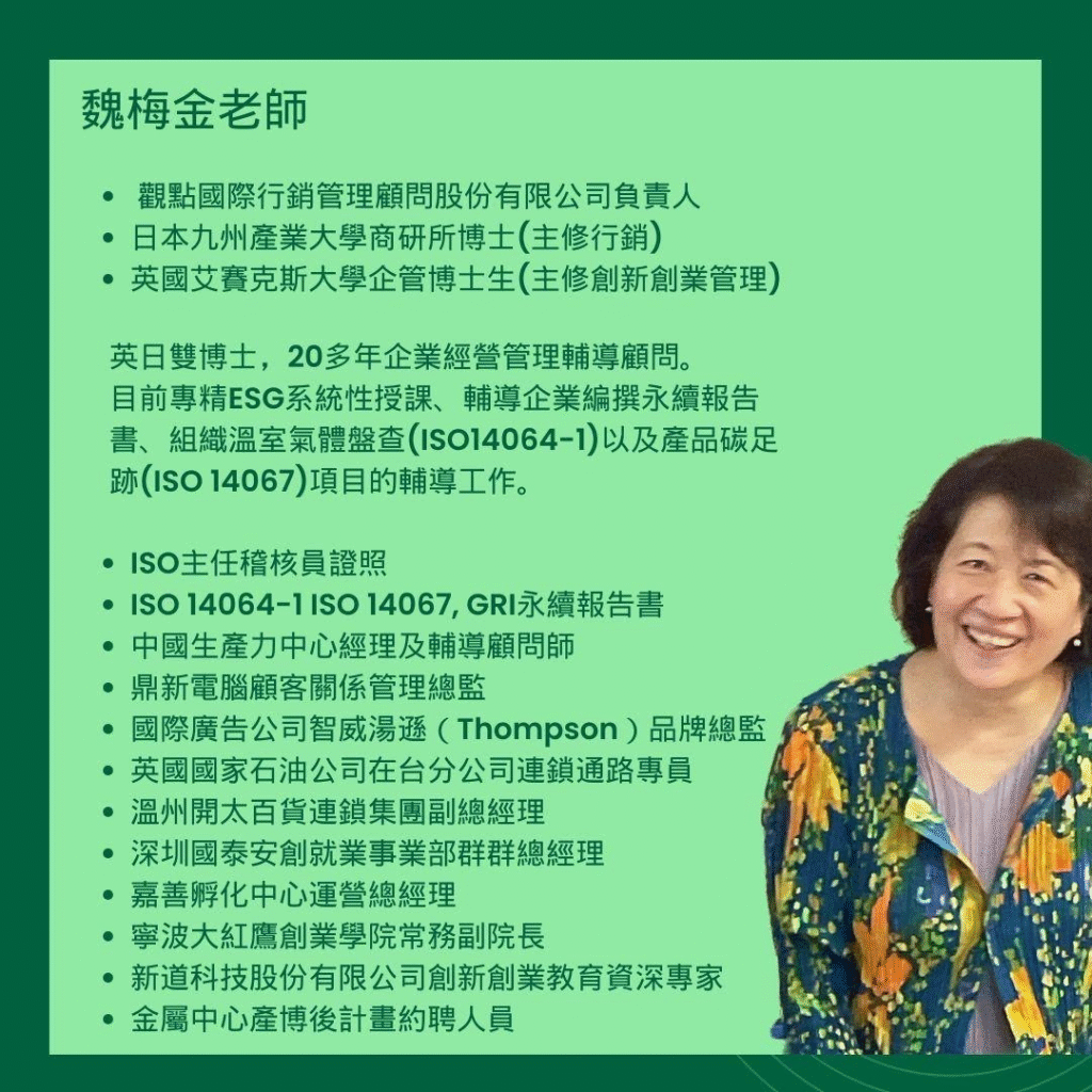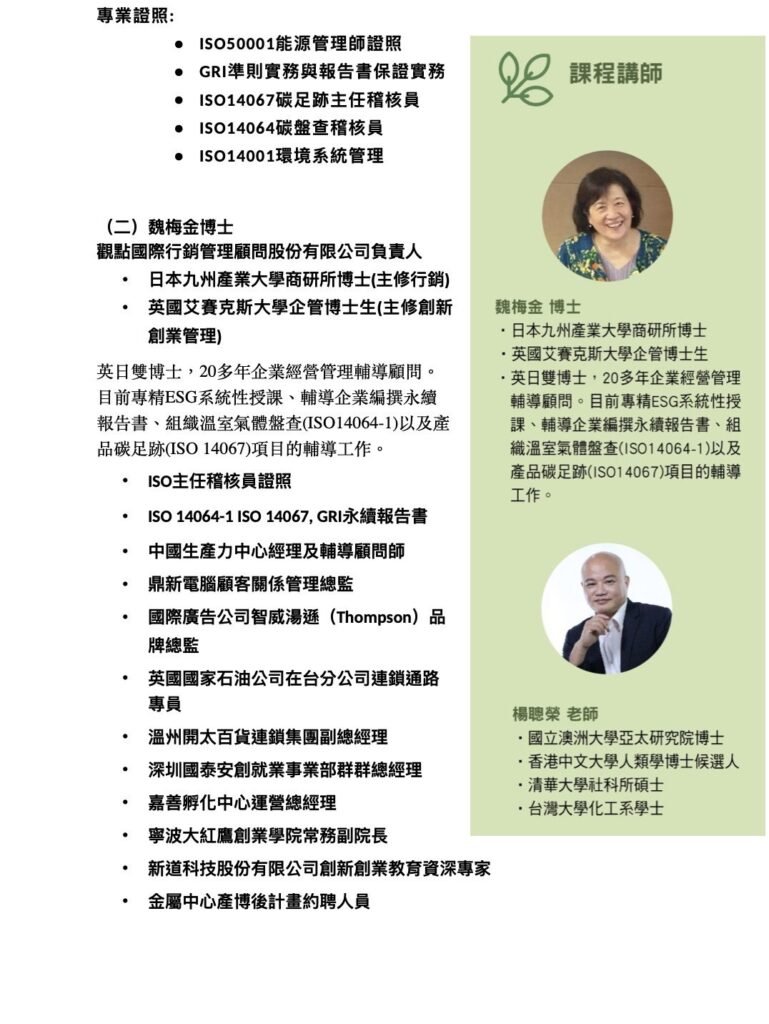 英日雙博士,20多年企業經營管理輔導顧問。目前專精ESG系統性授課、輔導企業編撰永續報告書、組織溫室氣體盤查(ISO14064-1)以及產品碳足跡(ISO 14067)項目的輔導工作。