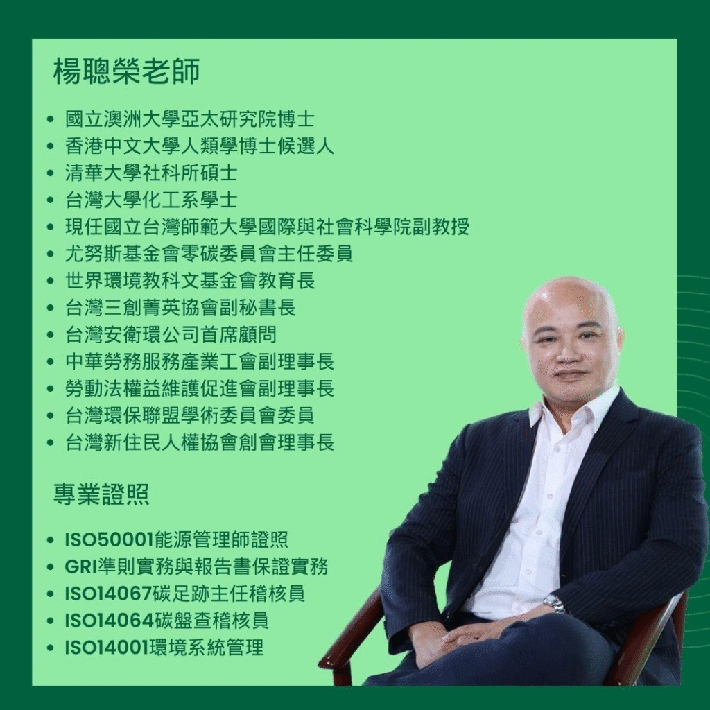 課程特色:本課程經由國內第一本碳盤查「碳盤查成功關鍵秘笈」專著,兩位作者楊聰榮博士、魏梅金博士親自授課。