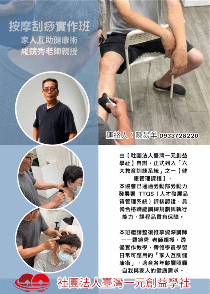 按摩刮痧實作班|家人互助健康術 × 羅鏡秀老師親授|社團法人臺灣一元創益學社六大教育訓練系統:健康管理課程